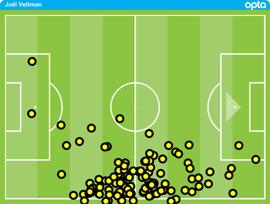 Voor de volledigheid hebben we hieronder een touchmapje van Veltman tijdens Ajax - Excelsior in de aanbieding. Je kunt op dit plaatje zien waar Veltman aan de bal was. Als je kijkt naar waar Veltman allemaal opduikt, mag je hem – ook al is hij gevormd als centrale verdediger – omschrijven als een geroutineerde rechtsback van Ajax.
