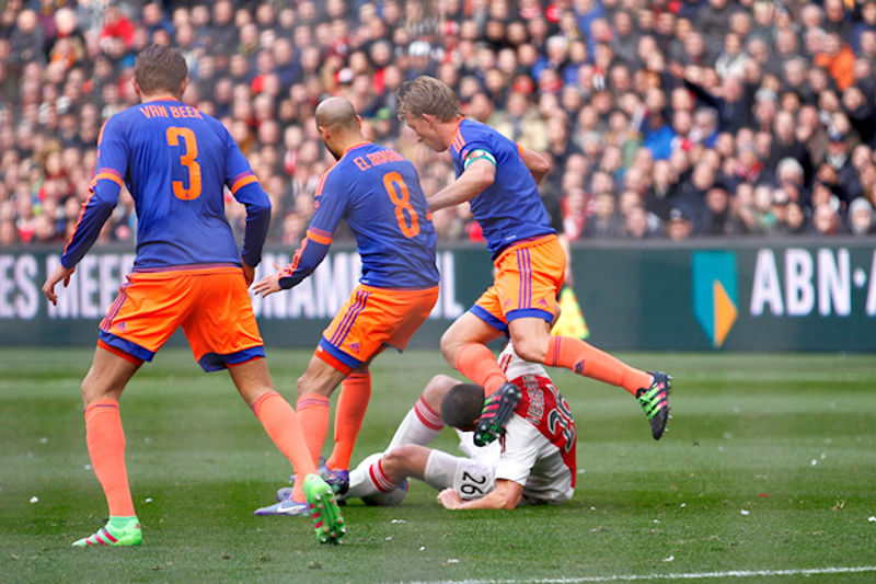 Wat is er aan de hand? Check de foto boven dit artikel eens. Ajax versloeg Feyenoord met zijn eigen wapens: passie, strijd en inzet. Er werd volle bak gegeven voor iedere bal, zelfs op de grond. Nick Viergever hield twee tegenstanders, toevallig El Ahmadi en Kuijt, van zich af en klemde daarbij even de bal tussen zijn benen.