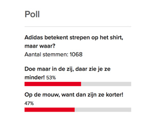 Daar staat echter weer tegenover dat de strepen langer zijn dan op de mouwen. Zeker zomers wordt er gespeeld met korte mouwen en dan zie je drie korte streepjes, omdat er ook nog badges op de mouwen komen. Precies 46 procent van de fans op onze website gaat mee in die gedachte.