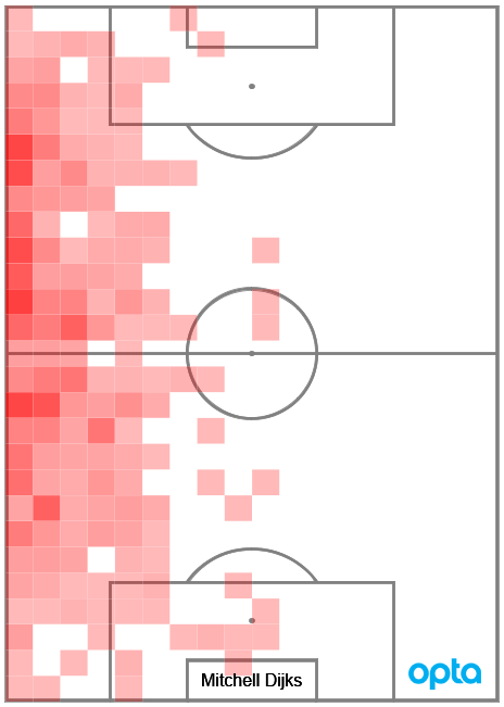 Het is ook leuk om te kijken naar de rollen die Sinkgraven en Dijks vertolken, al kunnen we bij Dijks beter spreken over vertolkte. Je kunt aan de heatmap van Dijks afzien dat hij een tijdje bij FC Volendam heeft gespeeld, want hij gaat heen en weer, heen en weer en nogmaals heen en weer.