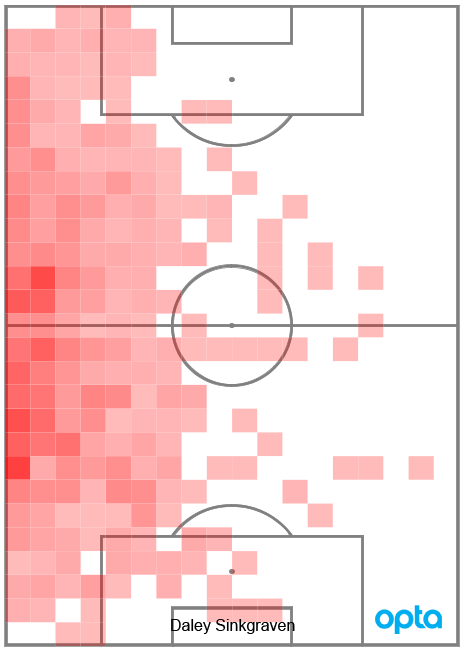 Het aantal voorzetten is ook duidelijk gestegen, bijna verdubbeld zelfs. Dribbelen en passen doet Sinkgraven dan wel weer veel minder. Ook zien we minder tackles. Wel zijn de tackles die Sinkgraven besluit in te zetten wat succesvoller dan gedurende de wittebroodsweken.