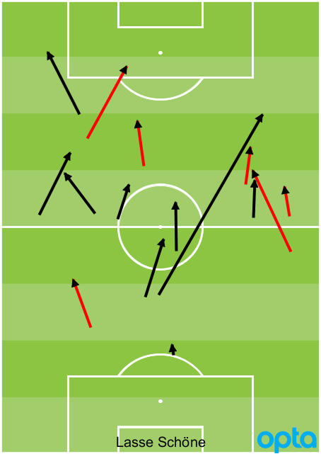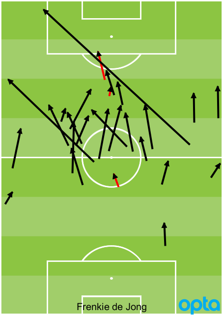 De Jong verstuurde tegen Vitesse veel meer passes naar voren dan Schöne deed tegen Heerenveen. Als je de afbeeldingen zo bekijkt, lijkt het wel de omgekeerde wereld ten opzichte van het spelbeeld. De Jong verstuurde trouwens niet alleen veel meer passes, hij was ook nog eens een stuk zuiverder.