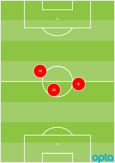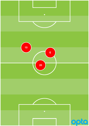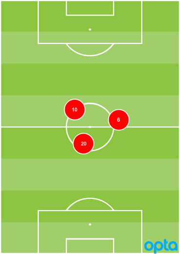 Afbeelding 4: Gemiddelde posities middenveld Ajax tijdens Sparta-thuis.