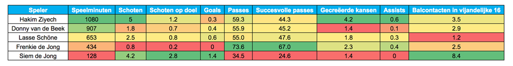 Afbeelding 1: Vergelijking van de aanvallende statistieken van de Ajaxmiddenvelders.