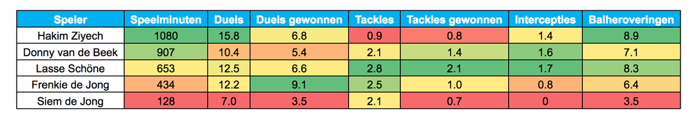 Hierboven zie je opnieuw een afbeelding waarvan je niet moet schrikken. Dit keer gaat het dus om de cijfers op verdedigend vlak van Donny en de anderen. Qua duels doet alleen Siem het minder goed dan Van de Beek, qua balveroveringen blijft hij achter bij Schöne en Ziyech. Hij scoort wel aardig qua tackles en intercepties.