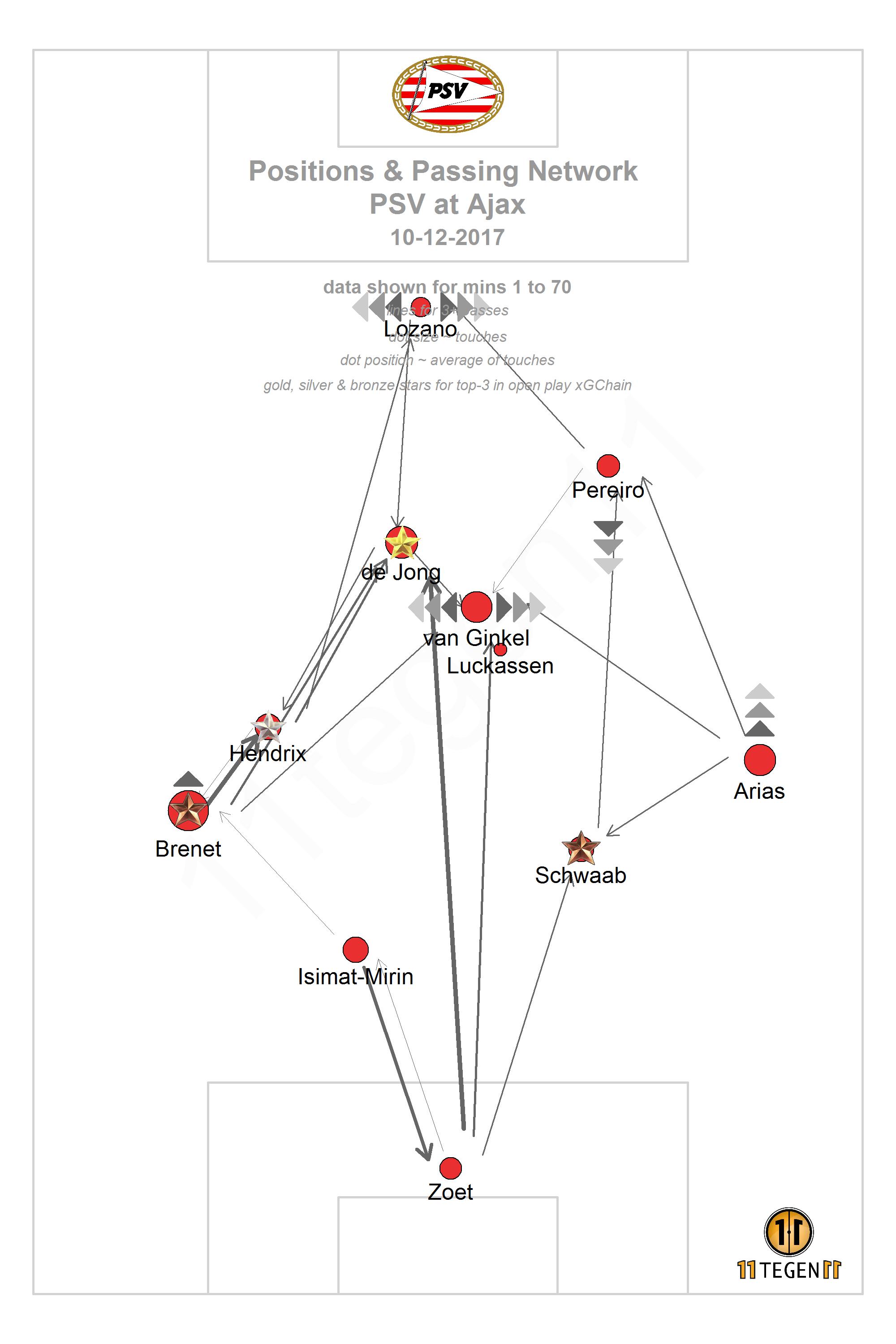 Best opvallend is trouwens ook het verschil tussen Wöber en Veltman. De linksback stond veel hoger dan de rechtsback, die natuurlijk niet mocht vergeten om Hirving Lozano te dekken. De Mexicaan is een van de betere buitenspelers van de eredivisie, maar Veltman beteugelde dat gevaar uitstekend. Er loopt vanuit Lozano slechts een enkel lijntje naar De Jong, maar veel gevaar leverde dat niet op.