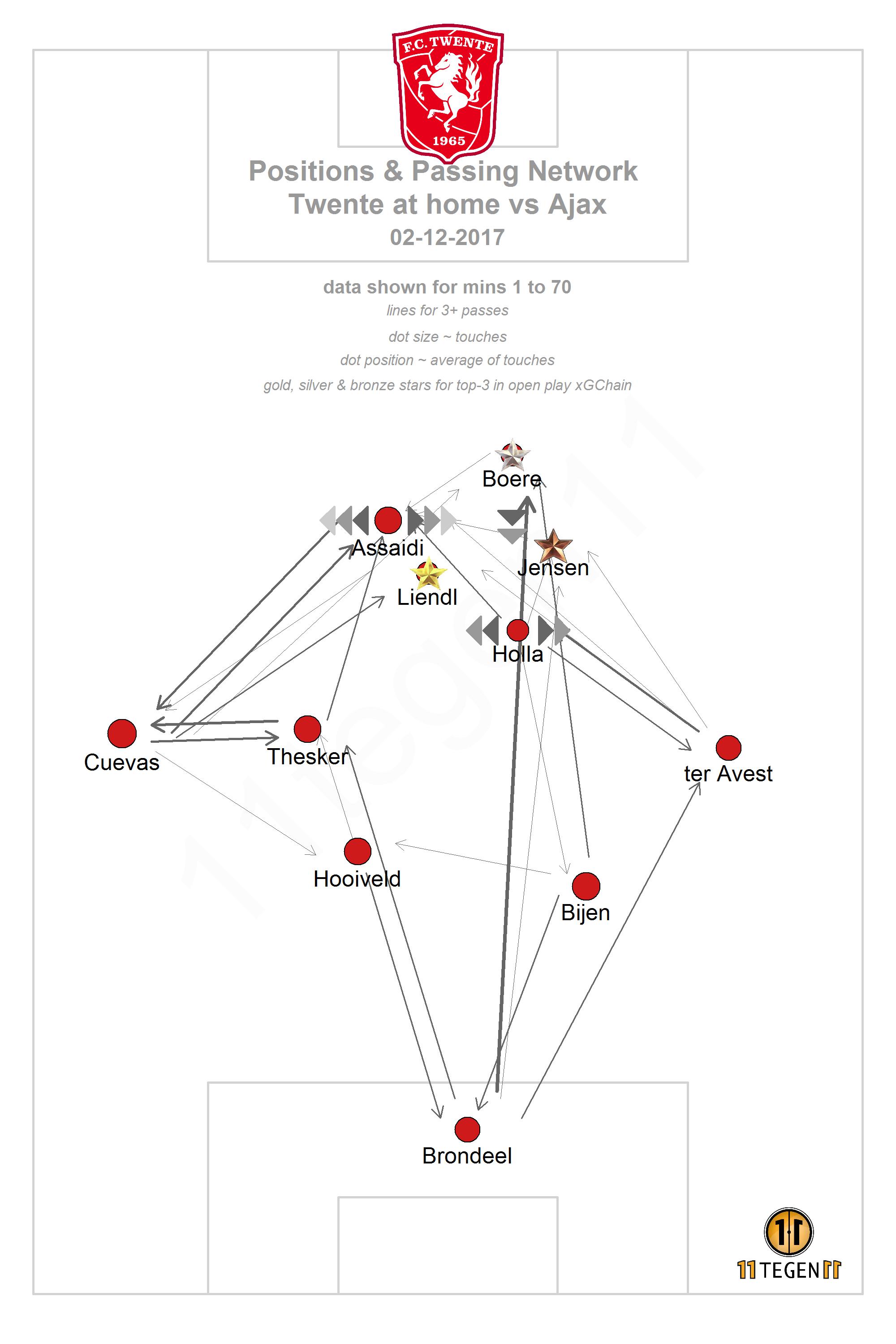 Hoe anders was dat voor Twente! Ze zullen zich in Enschede nog wel eens achter hun oren krabben, want ze wisten het Ajax flink moeilijk te maken. Je ziet bij Twente een aantal grote stippen, dicht bij het doel zelfs, om nog maar eens aan te geven dat er meer doelpunten hadden kunnen vallen.