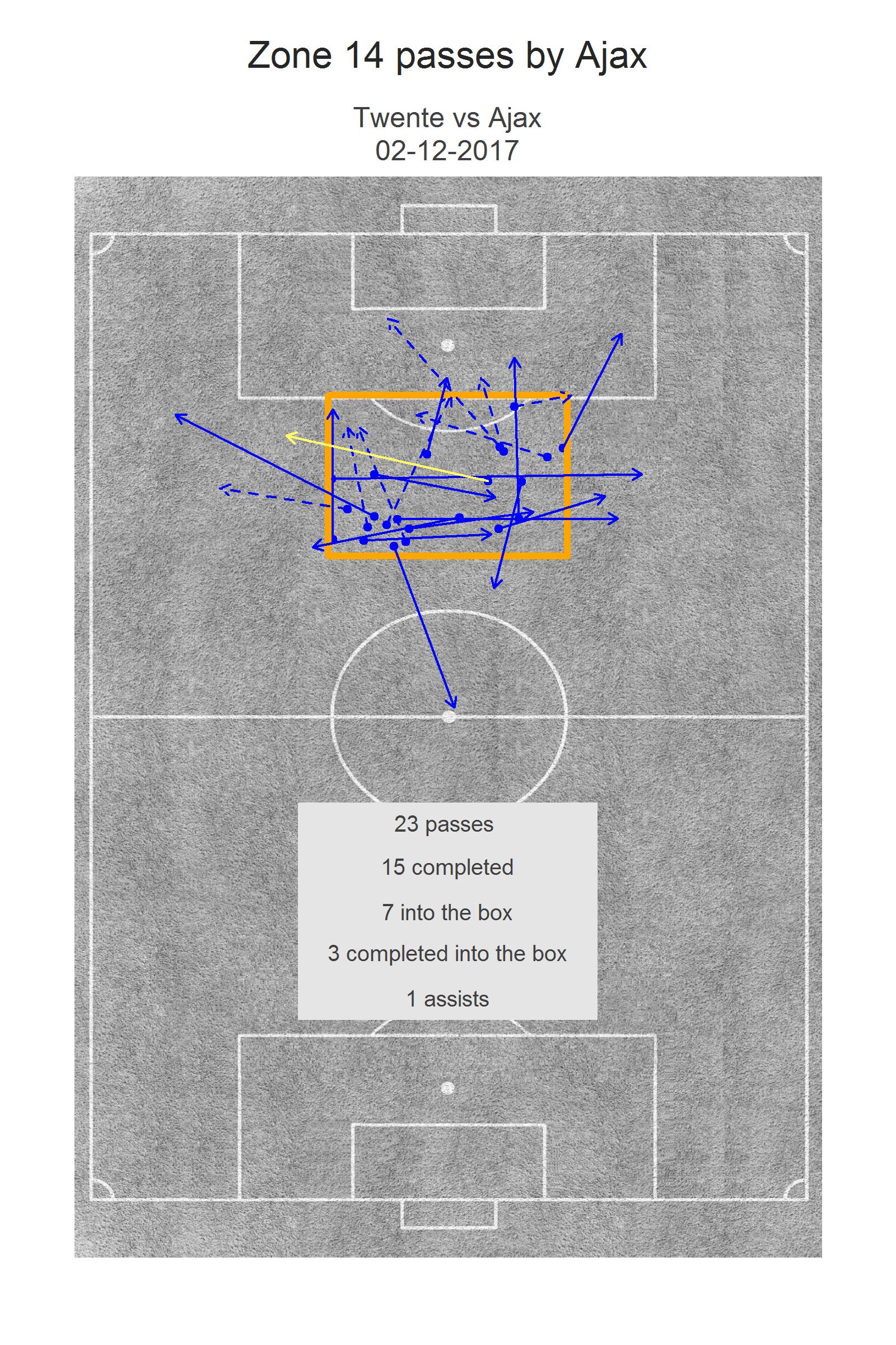 We sluiten daarom af met een klein extraatje: de afbeelding van zone 14. Het lukte een Ajacied slechts drie keer om de bal vanuit deze zone in de vijandelijke zestien bij een medespeler te bezorgen. Als je bedenkt dat een goede pas vanuit dit gebied in feite gelijk staat aan doelgevaar, is direct duidelijk waarom Ajax er niet in slaagde om een serieuze vuist te maken...
