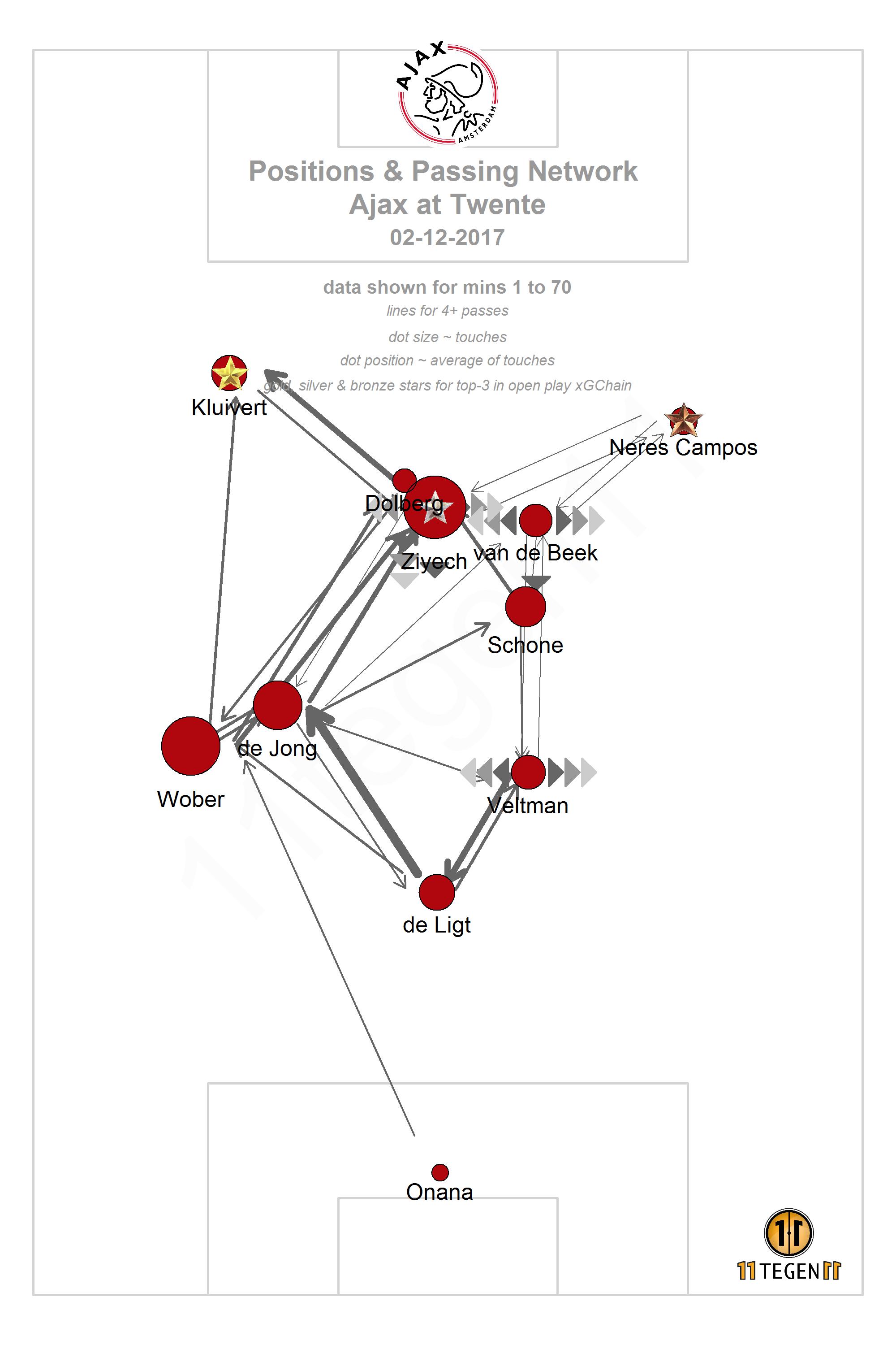 De kwestie rond Ziyech is ook weer interessant. Er staat een grote stip boven zijn naam, als teken dat hij veel aan de bal was en hij heeft een zilveren ster, om aan te geven dat hij betrokken was bij het doelgevaar dat voortkwam uit open spel. Maar waar zijn de lijntjes naar medespelers? Die zijn er maar weinig. Dat kan helaas ook niet anders als je maar liefst 40 keer balverlies lijdt, goed voor een negatief eredivisierecord dit seizoen.