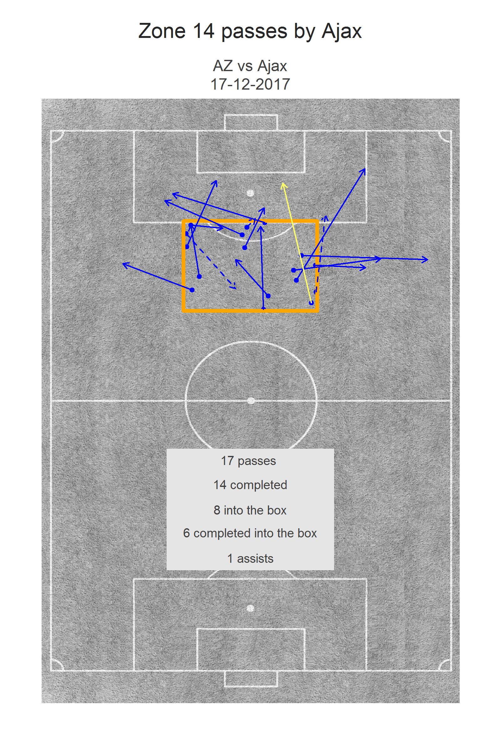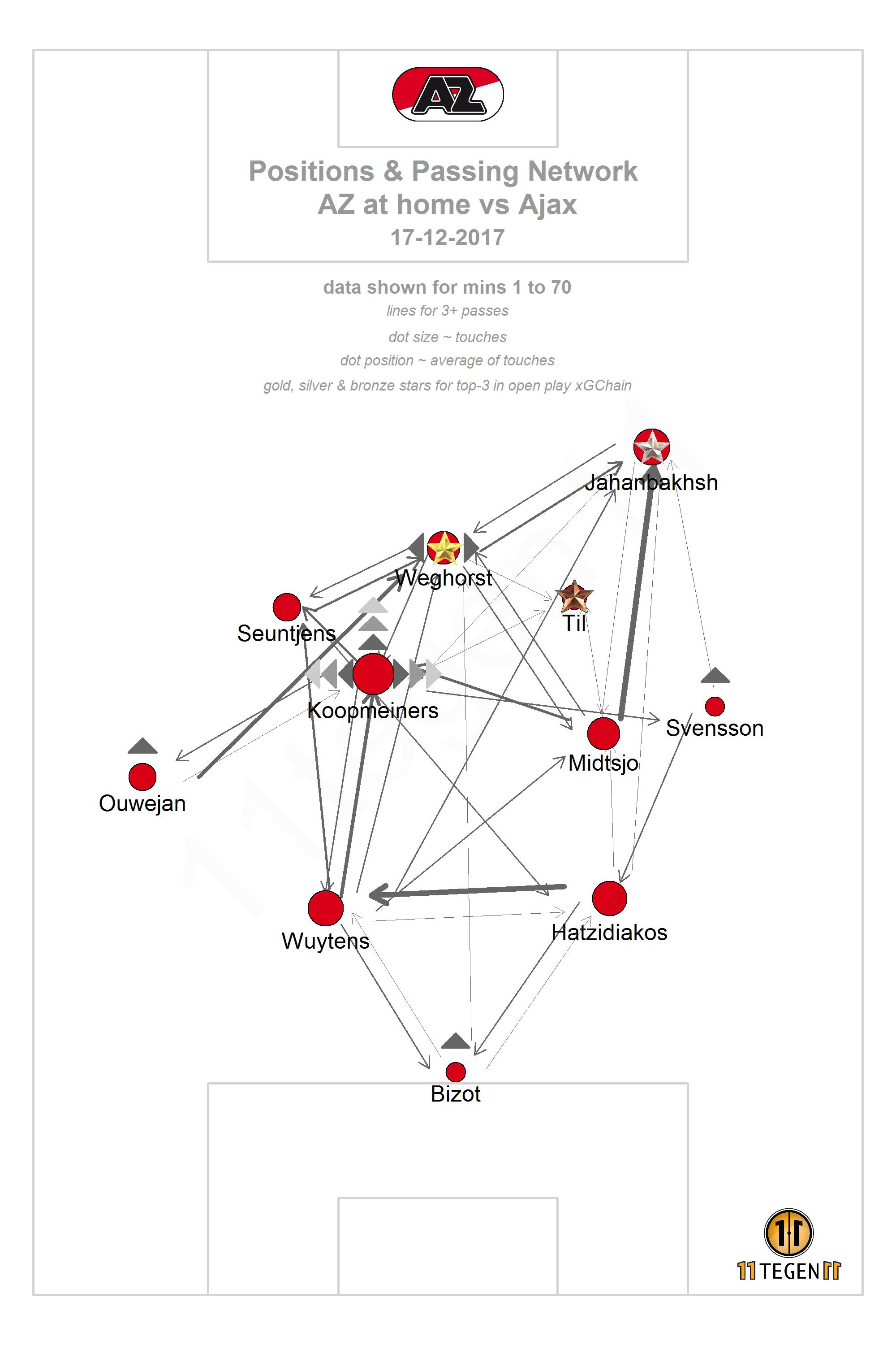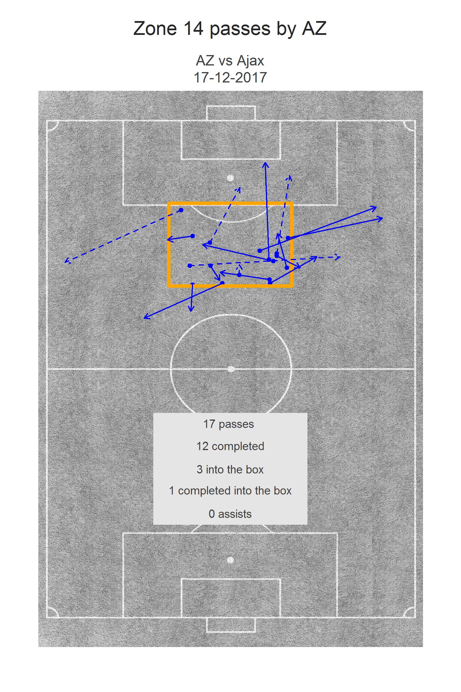 Andersom zie je vrij goed dat Ajax erin slaagde om AZ behoorlijk weg te houden bij het doel. AZ kwam tot slechts een enkele pass die aankwam in de buurt van het Ajaxdoel. Veel vaker moest het uitwijken naar de rechterzijde, naar Jahanbakhsh, maar daar ontbrak het dus aan de voortzetting.