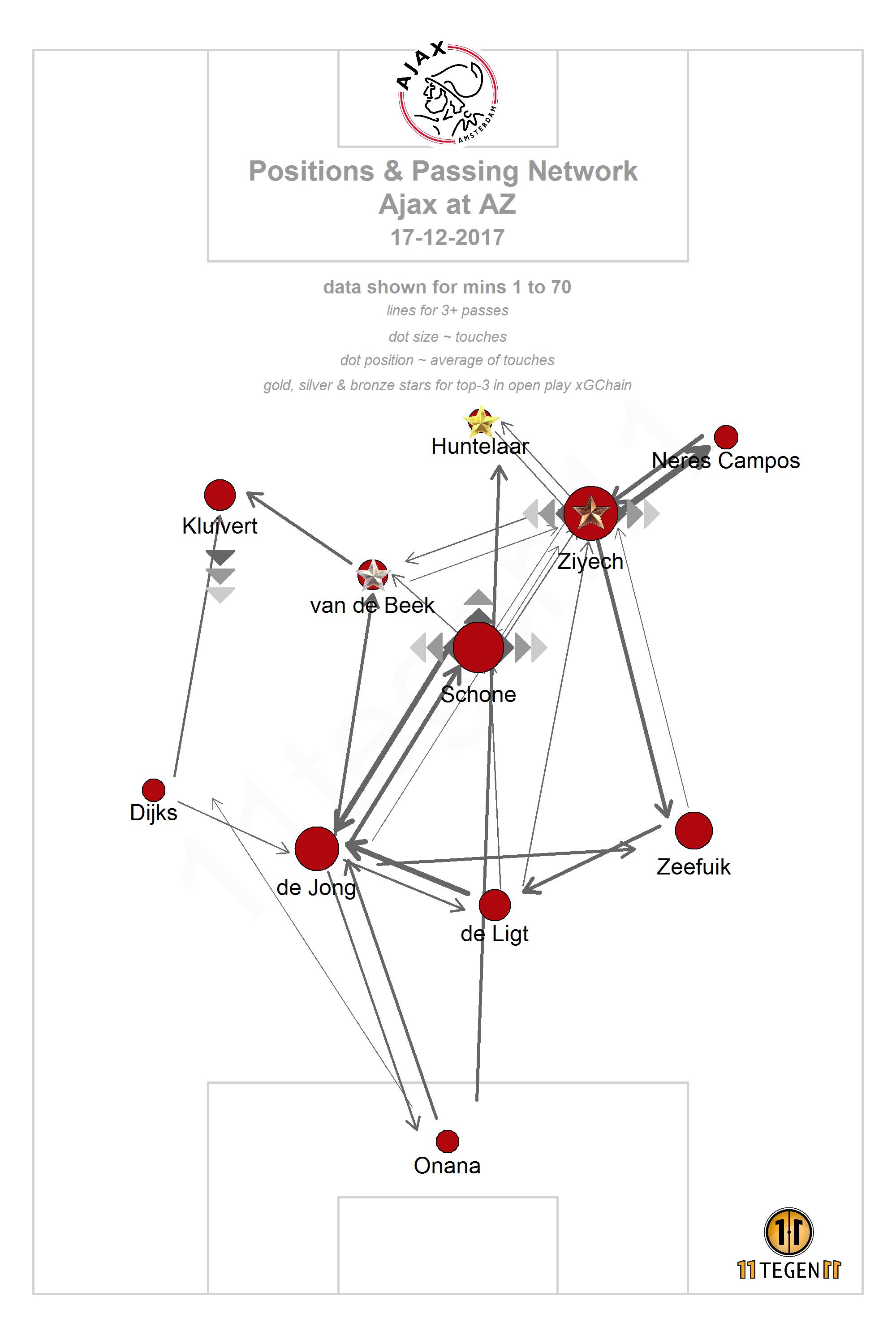 We trappen dit keer af met de passmaps, want er is iets bijzonders aan de hand. Kijk eens naar de gemiddelde positie van Hakim Ziyech. Ziyech speelde tegen AZ meer dan anders vanaf de rechterkant. Als je naar passmaps van vorige wedstrijden kijkt, staat de spelmaker meer naar binnen of helt zijn gemiddelde positie zelfs over naar links.