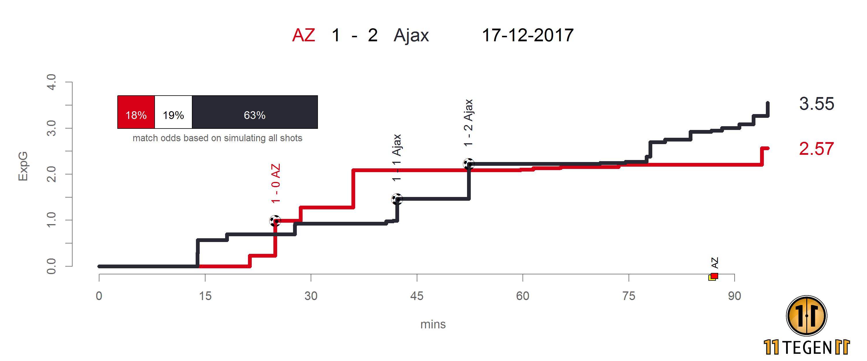 Het zegt in die zin genoeg dat AZ tot een xG-waarde komt van 2,57, terwijl Ajax hier 3,55 tegenover zet. Dit zijn hoge waarde, ook als je een correctie (1,80 versus 2,79) toepast voor de penalty’s. Het had dan ook zomaar 3-3, 4-2 of 1-5 kunnen worden, al was de kans op een overwinning van Ajax te allen tijde 63 procent.