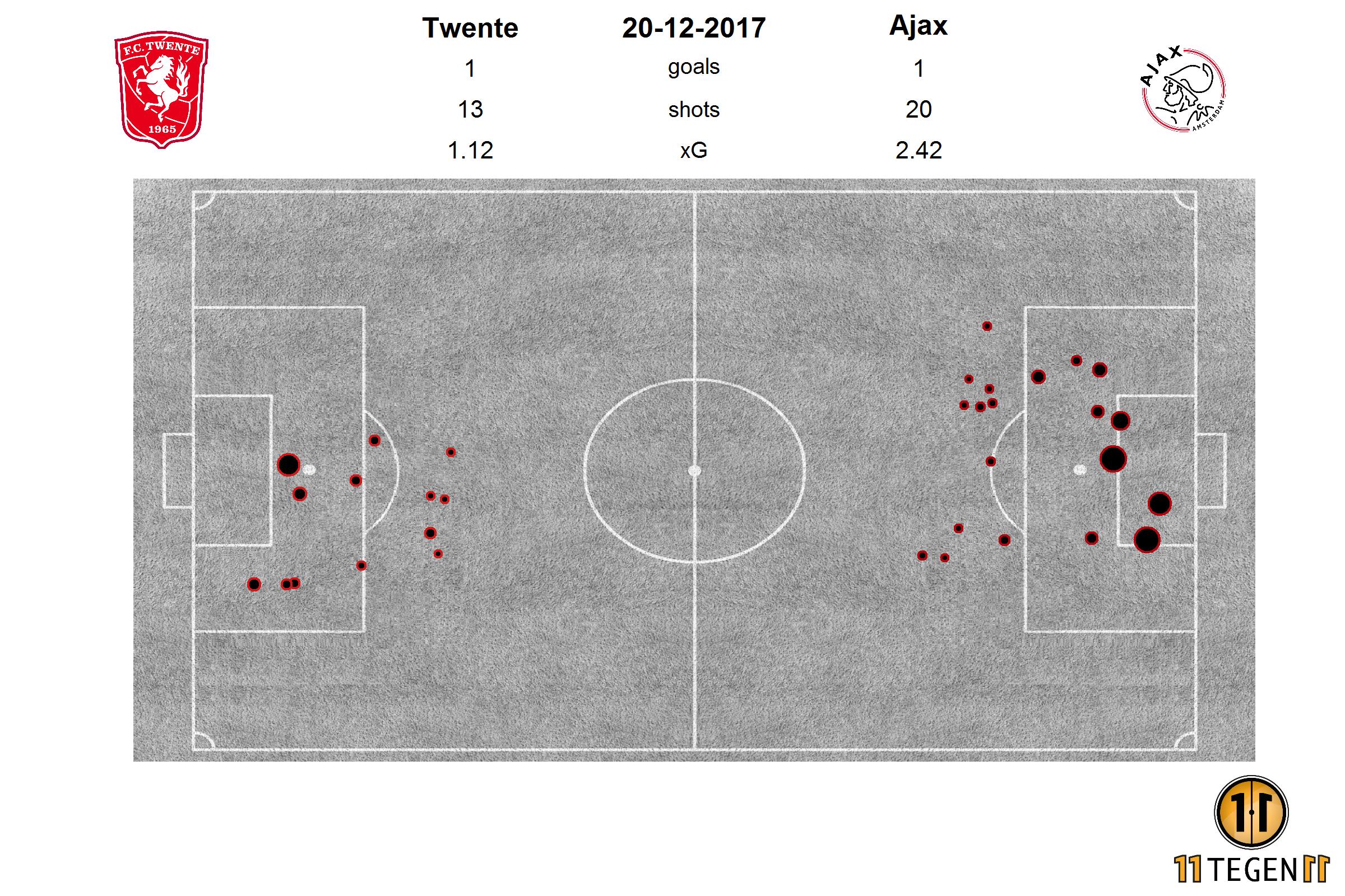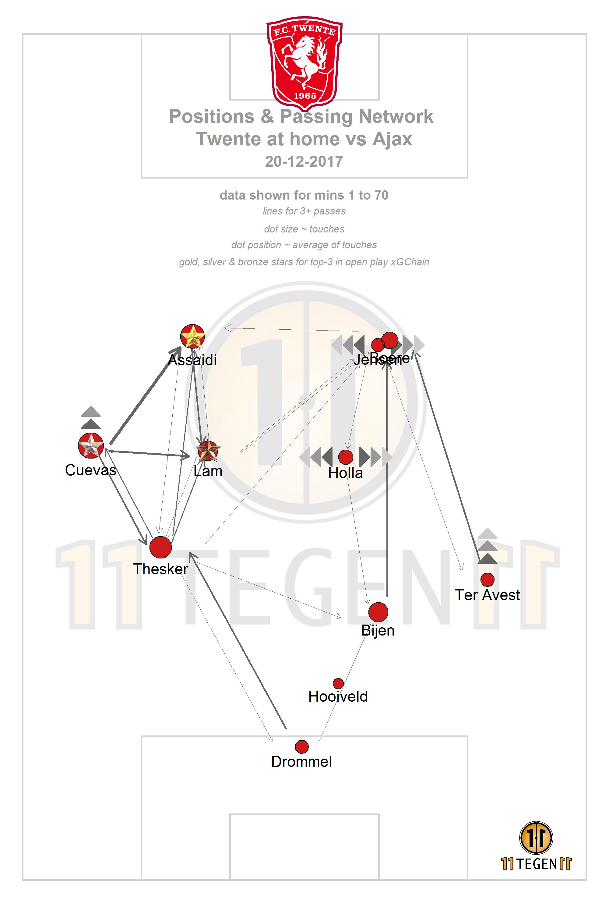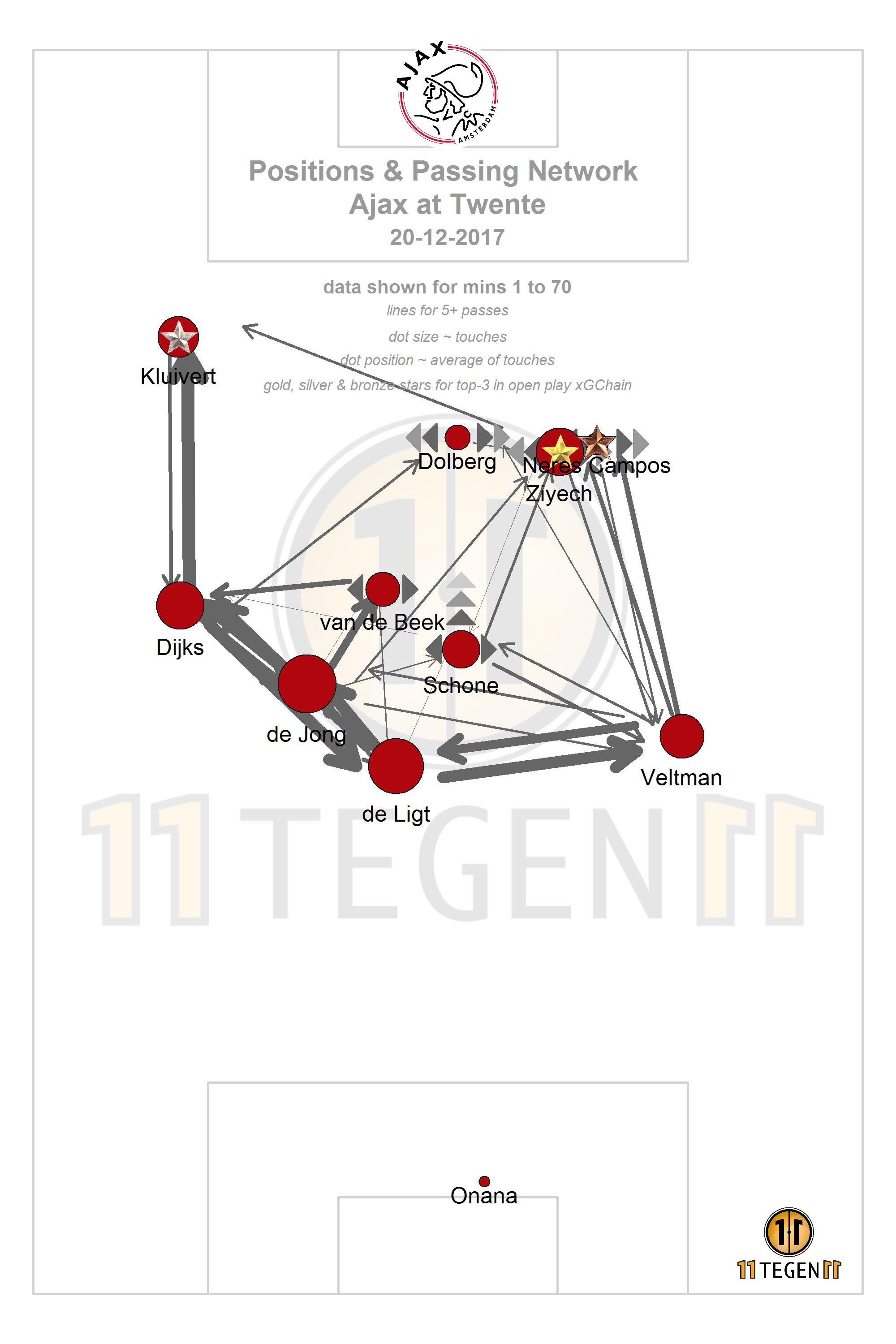 Het is ook opvallend dat het middenveld zo uit elkaar werd getrokken. Ziyech stond gemiddeld veel hoger op het veld dan Van de Beek en Schöne. Hun stippen zijn wel ongeveer even groot, wat maar aangeeft dat dit trio ongeveer even vaak balbezit kende. Meestal is de stip van Ziyech juist groter ten teken dat het spel om hem draait, maar dit keer niet. Twente neutraliseerde de wedstrijd.