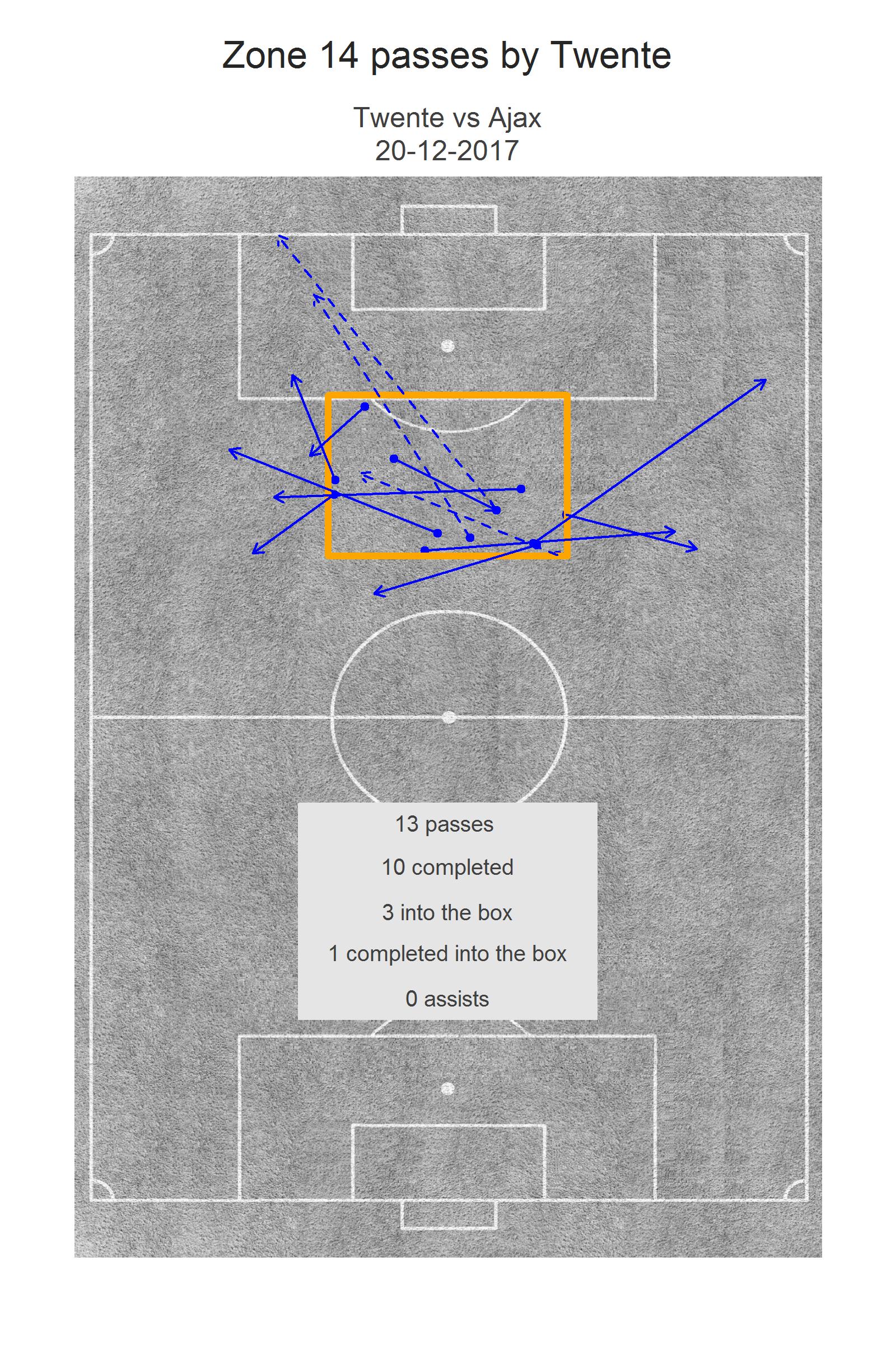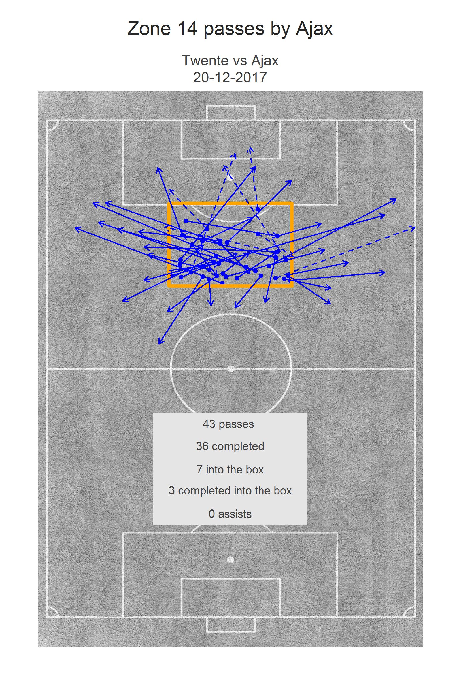 We stipten al aan dat de passmap van Ajax doet denken aan de vorm van een hoefijzer. Er bestaat aanvullend bewijs om deze bewering te ondersteunen. Dit aanvallende bewijs wordt geleverd door een weergave van de Ajaxpasses in zone 14. Dit is de zone van het veld waarin passes vooruit het meest gevaarlijk zijn, omdat de bal dan richting of zelfs in het zestienmetergebied komt.