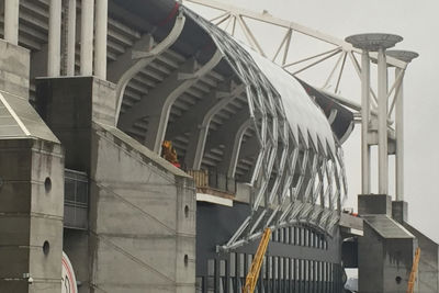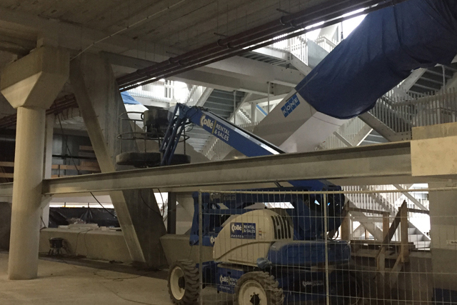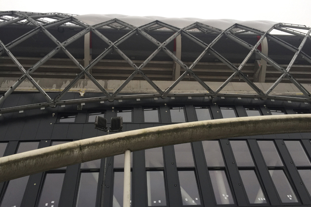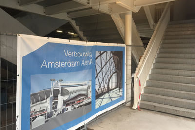Maar er is meer. Er is altijd meer. De Ajaxspelers mogen even genieten van de winterstop, maar de mannen met helmen rond de Arena gaan gestaag door met hun noeste arbeid. Zo zien we stalen wenteltrappen die op hun plek zijn gezet en ook de noodzakelijke roltrappen - weliswaar nog afgedekt - staan allemaal al op hun positie.