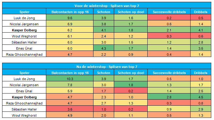Dolberg speelde voor de winterstop uiteraard meer wedstrijden, maar je kunt wel degelijk iets eruit opmaken. We zagen al dat de Deen minder balcontacten heeft in de vijandelijke zestien, maar ook de balcontacten daarbuiten zijn verder weg van de goal. Alsof hij meer teruggetrokken speelt. Dan wordt het wel erg moeilijk om doelpunten te maken.