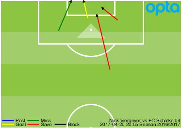 Afbeelding 2: Een overzicht van de ballen die Viergever op het Schalke-doel afvuurde.