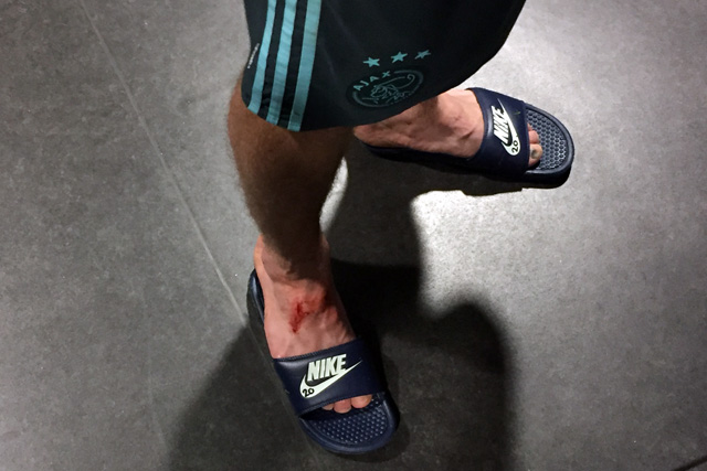 Badslippers zijn voor voetballers soms een uitkomst. Zoals voor Lasse Schöne na Olympique Lyon - Ajax. De middenvelder kreeg een trap tegen zijn voet, met een flinke wond en bloeduitstorting tot gevolg. Maar het halen van de finale werkt verdovend.