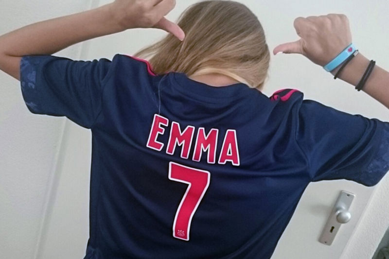 De fanshop stond ook op het programma voor vandaag, want we zouden voor dochter Emma het nieuwe uitshirtje meenemen. Ze had een prima eindrapport, dus ze mocht kiezen: het begeerde trainingspak of uitshirt met bedrukking. Het werd tóch het laatste. Als rechtsbuiten gaf ze ons een duidelijke opdracht mee: “Willen jullie nummer 7 erop laten drukken? Met Emma erboven?”