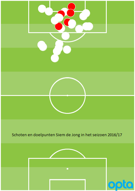 Als Ajax erin slaagt om Siem, net als in Eindhoven, de middenvelder te laten zijn die aansluit bij de spits, dan kan het leuk worden. Kijk eens goed naar de bovenstaande afbeeldingen. De Jongs doelpogingen in dienst van PSV vonden bijna allemaal plaats binnen het vijandelijke zestienmetergebied. Al zijn doelpunten kwamen tot stand van binnen ‘de zestien’. Je ziet slechts 5 bolletjes en geen 6 omdat hij tweemaal een penalty benutte.