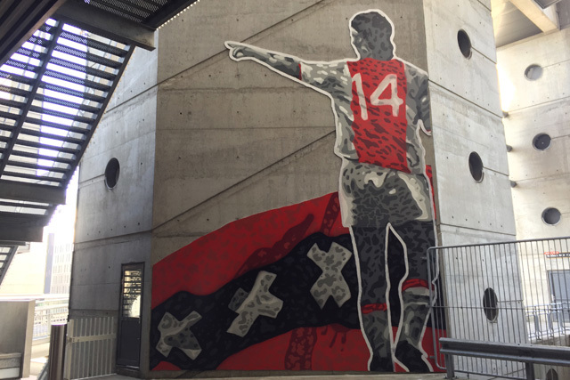 De Johan Cruijff Arena is weer een stukje fraaier geworden! Er zijn diverse borden vol graffiti geplaatst, die samen een metershoge afbeelding vormen van de man naar wie het stadion is vernoemd. Je ziet Cruijff al wijzend in zijn karakteristieke pose.