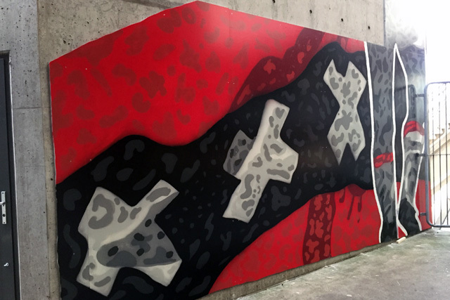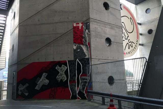 De graffiti zal alleen niet supergoed zichtbaar zijn voor supporters die rond wedstrijden van Ajax het stadion bezoeken. De graffiti hangt aan de binnenkant van het dek en daar kom je niet als je de trap neemt naar boven of naar beneden.