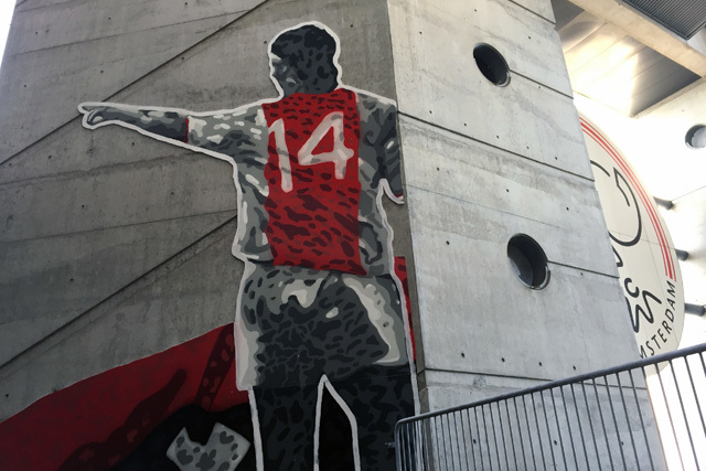 Als je een stadiontour doet of om een andere reden op het dek moet zijn, kom je wel langs de nieuwe graffiti van Cruijff. Dit geldt echter niet voor iedereen en daarom maakten wij een paar foto’s, zodat je de nummer veertien alsnog kunt zien wijzen.