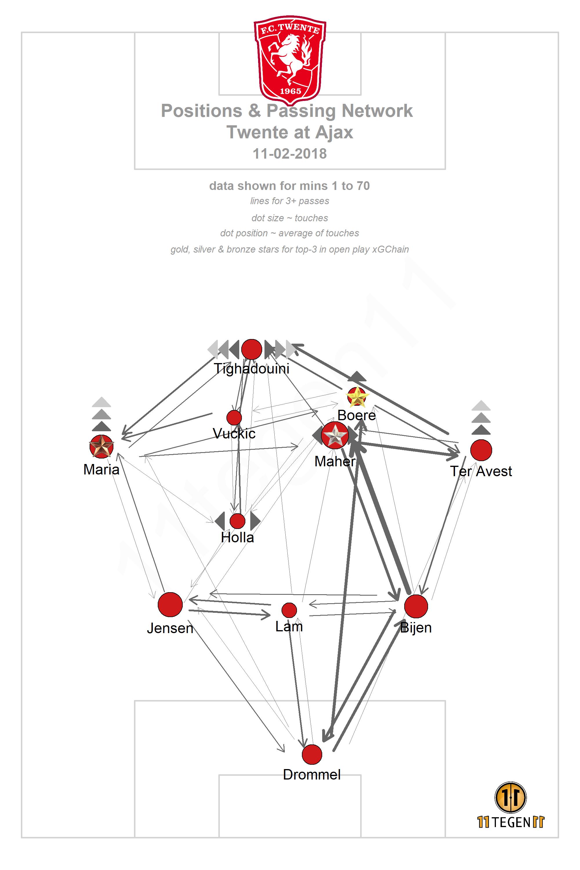 Ajax komt op zich nog tot 29 passes, waarvan 22 ballen een teamgenoot bereikten. Maar die rollen regelmatig van links naar rechts. Er ontstond op die manier in de tweede helft wel gevaar, als Ziyech tenminste de ontvanger was, maar als je de bal eerst naar buiten speelt en dan weer terug naar binnen moet, kun je je voorstellen dat je ook de drukte in voetbalt.