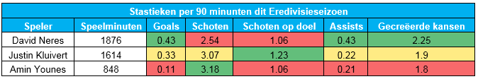 Hoe was dit voor de winterstop, toen Keizer nog voor de groep stond? Zie tabel 2! Het verval bij Kluivert valt nog wel mee. We schreven een paar weken terug al een analyse over de talentvolle buitenspeler, die we nog niet klaar vinden voor een transfer, al is het maar omdat hij zijn rendement moet verhogen.