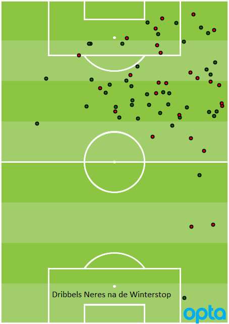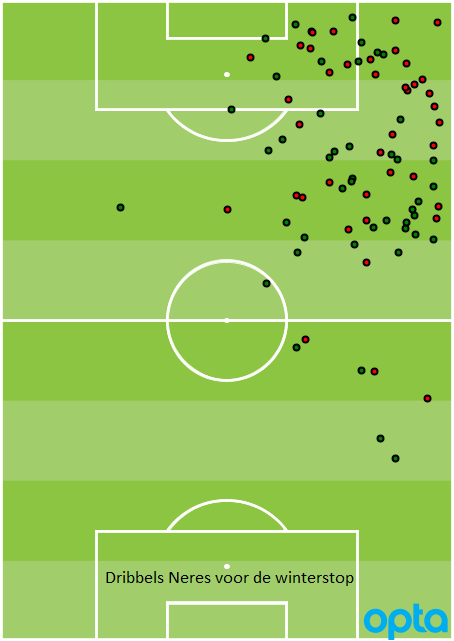 Als er van een vormdip bij Neres geen sprake is, waarom denken velen dan van wel? De afbeeldingen hierboven geven het antwoord. Neres dribbelde voor de winterstop vooral op de rechterflank, inmiddels is hij vooral centraal op het veld actief. Daarnaast maakt hij zijn dribbels ook minder ‘diep’ op het veld, verder weg dus van het doel.