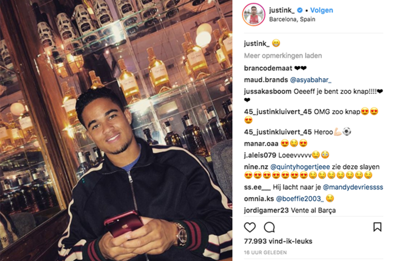 Wat heeft 77.993 (and counting) likes en 1.053 (and counting) reacties? Een Instagram-post van Justin Kluivert aan een tafeltje, ergens in Barcelona. Hij kijkt zijn volgers aan met een gulle lach. Een begeleidende tekst over het hoe, wat en waar ontbreekt. We weten toch al dat hij in Barcelona is.
