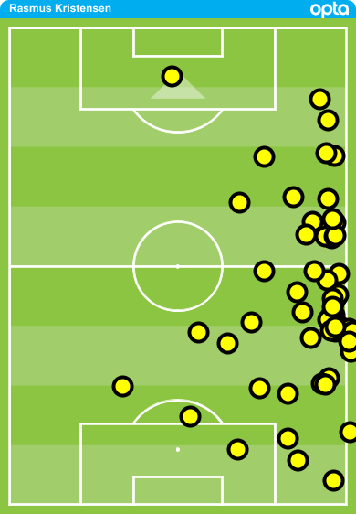 De kracht van de twintigjarige Kristensen schuilt ‘m in aanvallende impulsen, hebben we ons laten vertellen, dus het is wel leuk om daar als eerste het vizier op te richten. Wat blijkt uit navraag van ons bij Opta Sports? Hij komt er in offensief opzicht goed uit.
