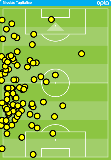 Tot op heden zien we de Deen vooral terug langs de zijlijn. Check de touchmaps maar waarin we de balcontacten van Kristensen en Tagliafico vergelijken. De Argentijn waaiert veel meer uit, Kristensen speelt nog net niet met het kalk aan zijn schoenen.