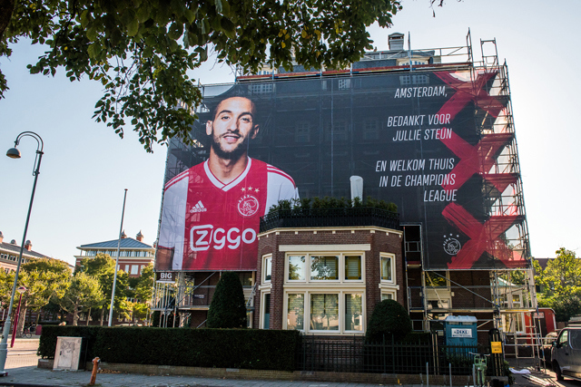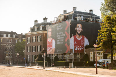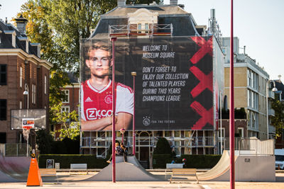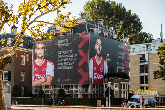 Dit is gaaf. Heel gaaf. Twee gigantische doeken werden dinsdag aan de rand van het Museumplein gehangen. Ajax en Amsterdam maken zich op voor het miljoenenbal.