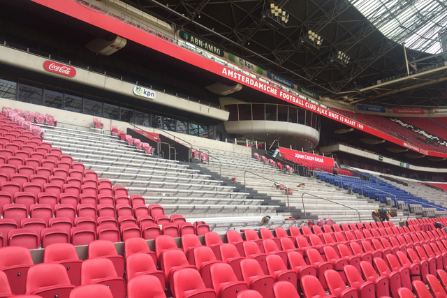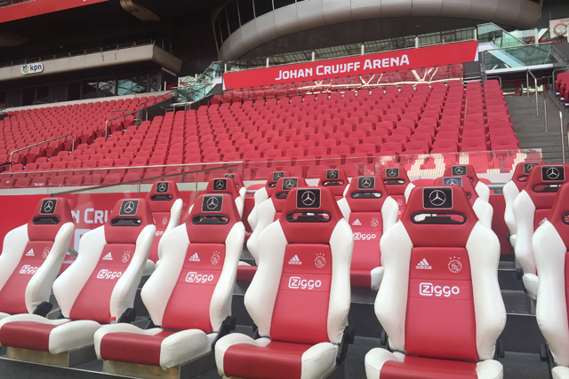 En zo is het ook. Precies op tijd voor Ajax - FC Groningen (als het allemaal doorgaat) is de Johan Cruijff Arena helemaal rood-wit. Wie heel kritisch kijkt, ziet dat in de skyboxen nog wel blauwe stoeltjes zijn gemonteerd, maar het is vast een kwestie van tijd voordat ook deze uit het stadion verdwijnen.