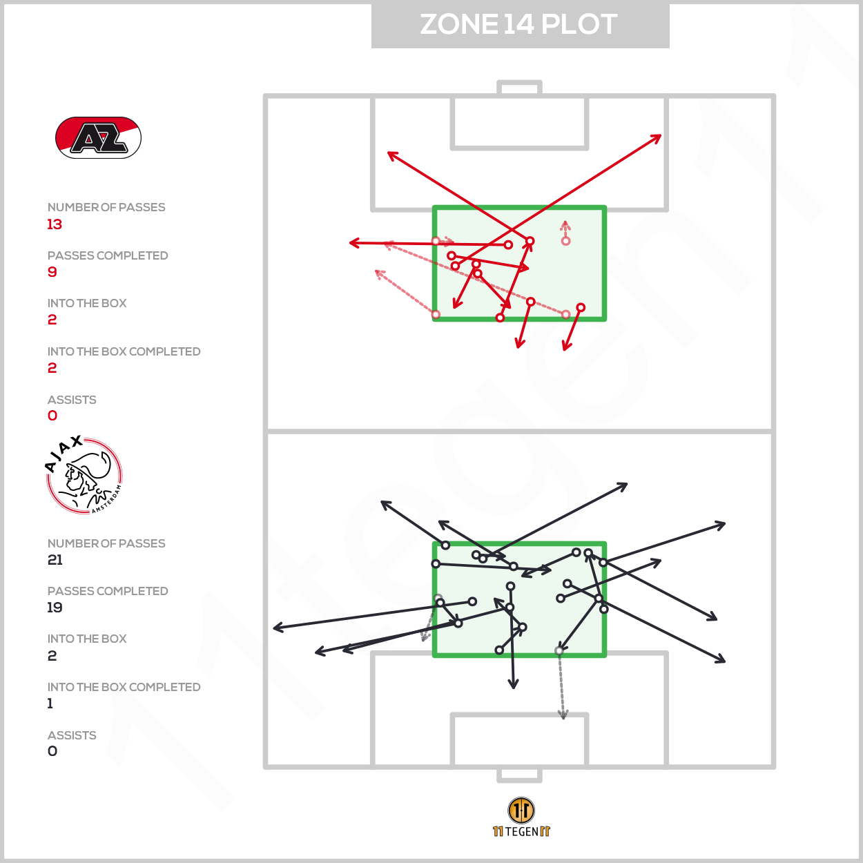 Als je de passmap van Ajax checkt, valt al op dat de spelers zich niet bepaald 'diep' op het veld bevinden. De cirkeltjes die de gemiddelde positie weergeven bevinden zich stuk voor stuk ver van het AZ-doel. Dit werkt door in de plots Zone 14 en halfspaces, want het is sinds de komst van Ten Hag zelden gebeurd dat Ajax zo passief voetbalde.