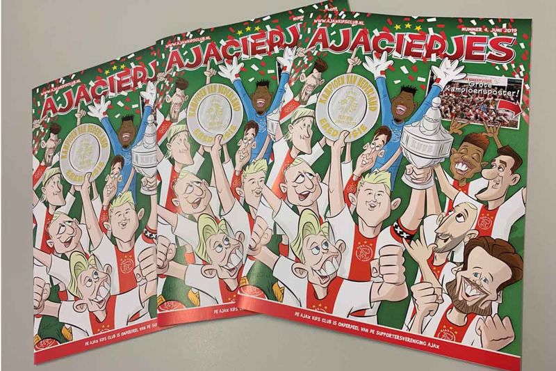 Het is natuurlijk een bijzondere Ajaciedjes geworden, want er viel heel wat te vieren! Ajax werd landskampioen en won ook nog eens de KNVB-beker. Daarom vroegen we onze tekenaar Henri Goldsmann een speciale cover te maken. Nou, dat kun je wel aan hem overlaten, zoals je hierboven ziet!