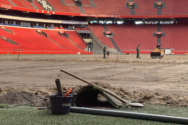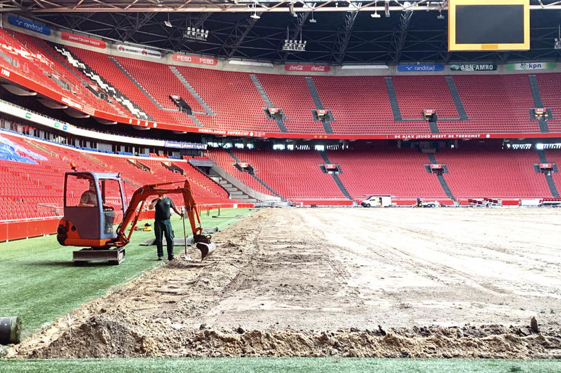 Medewerkers van het grasteam treffen duidelijk voorbereidingen voor de komst van een nieuwe grasmat, waarop Ajax en PSV elkaar zaterdag 27 juli treffen voor de wedstrijd om de Johan Cruijffschaal. We zien graafmachientjes doen wat graafmachientjes doen: afgraven en egaliseren.