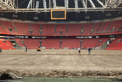 De bedoeling is helder: de ondergrond wordt alvast geprepareerd voor de enorme rollen gras die maandag met vrachtwagens het Arenadek op worden gereden. Navraag bij de Arena leert ook dat er nieuwe ontwikkelingen zijn.