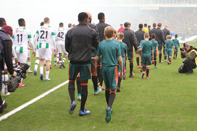 Toen de mascottes klaar waren met 'hun werk', stoven ze het veld af, op zoek naar papa of mama op de tribune. Daar zagen ze hoe dapper Groningen speelde tegen Ajax en toen het laatste fluitje klonk stond er 2-1 op het scorebord. Balen!! Ajax staat nog wel 'gewoon' bovenaan en speelt volgend weekeinde thuis tegen PSV. Ook weer spannend.