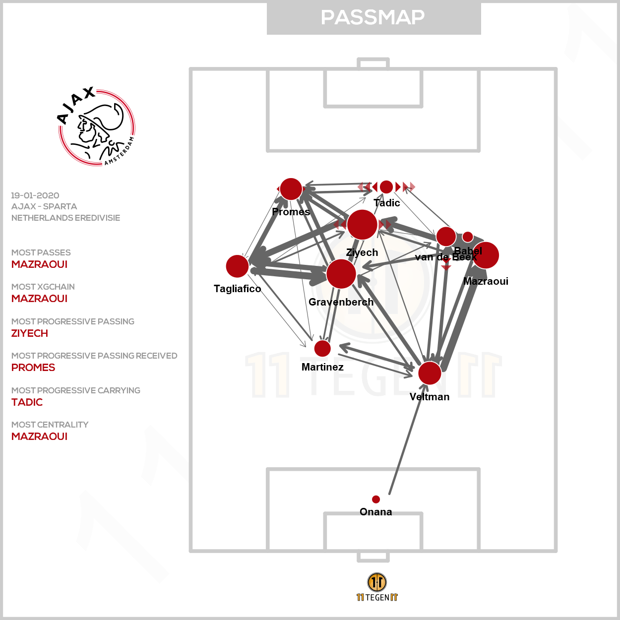 Wat moet er beter? Check de passmap en vooral ook de dynamische variant in de video. Dan zie je het vanzelf. Het springt ons in het oog dat de Ajacieden openen met passing diep op de helft van Sparta, maar dit zakt verder en verder terug. Waarom? Misschien wel omdat de zaken voorin nog niet zo goed op elkaar waren afgestemd.