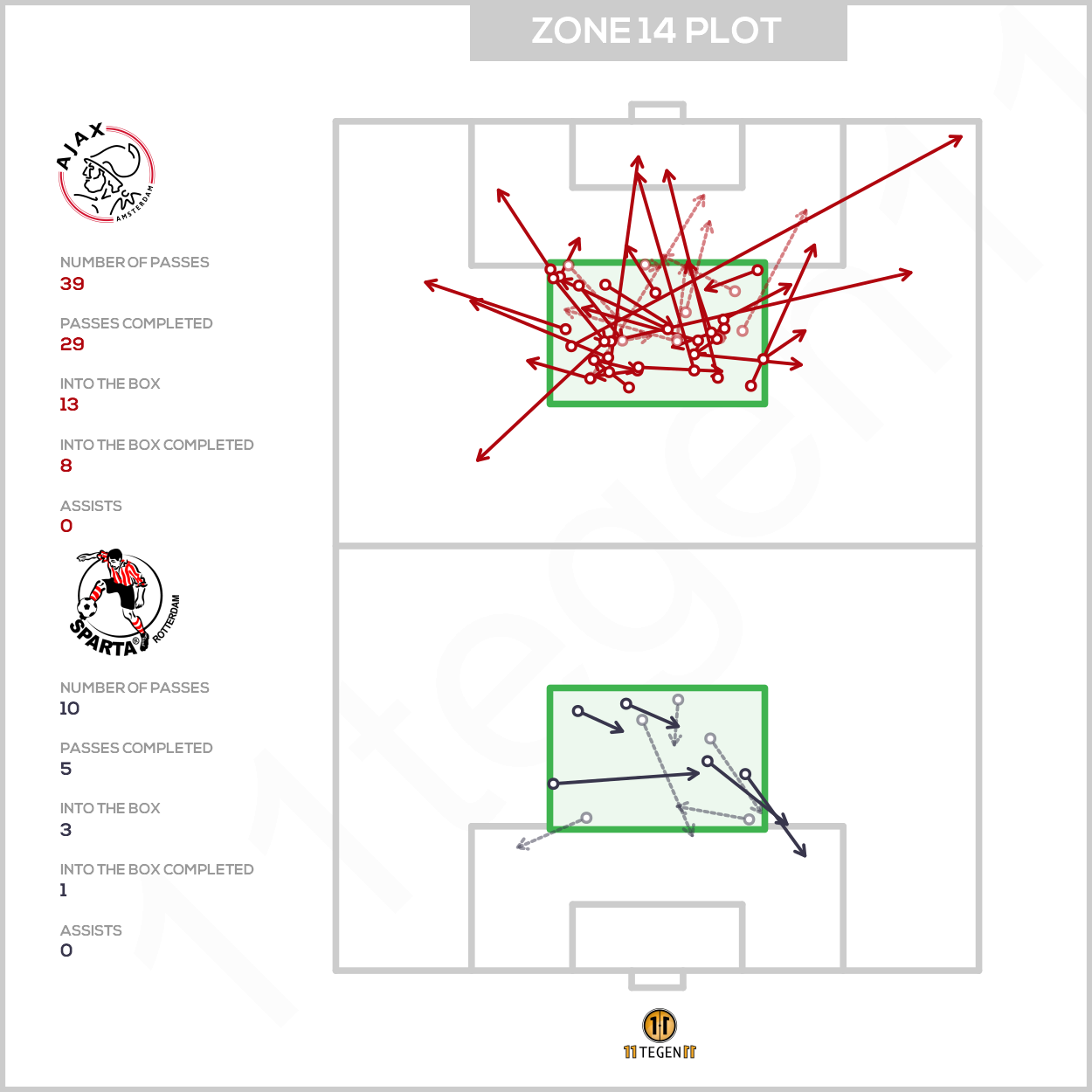 Als je kijkt hoe de gevaarlijkste aanvallen van Ajax tot stand kwamen, zie je twee gemene delers. Dit kun je opmaken uit de activiteit binnen Zone 14 en in de halfspaces. Kijk maar eens goed naar de streepjes richting het doel. Vanuit Zone 14 werden er ballen 'ingepompt', wat dus al meer in het oog sprong dan tijdens andere potjes, en ook vanaf de zijkanten was er activiteit.