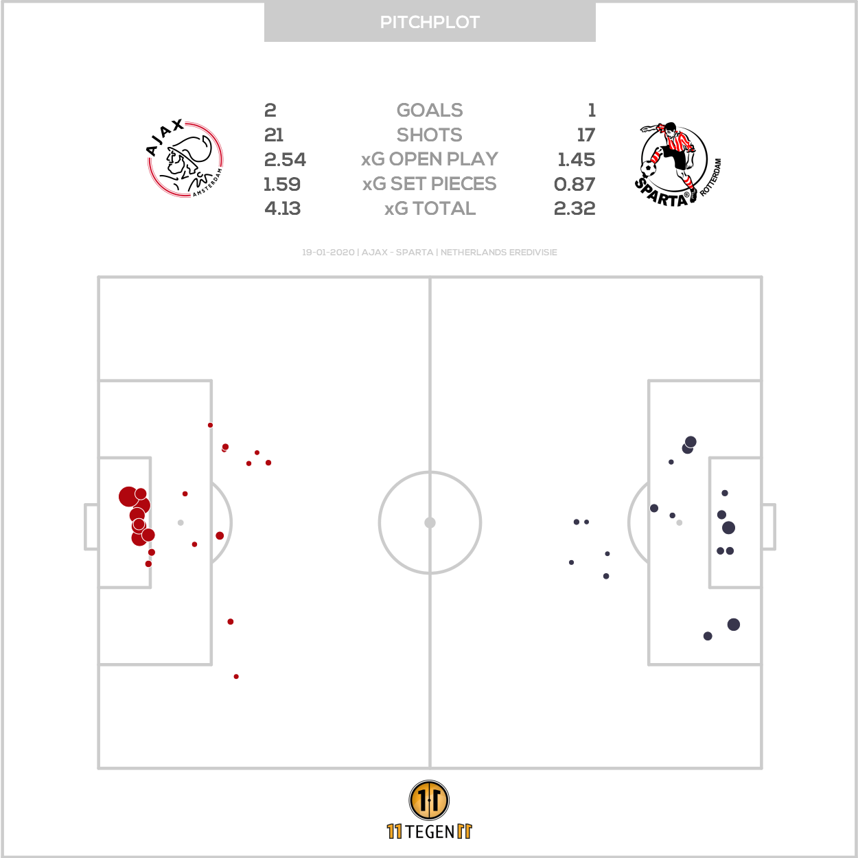 Als je het zo bekijkt, was Ajax tegen Sparta oppermachtig. Het plot verspringt tot en met de 2-0 van Ryan Gravenberch alsof je een trap oploopt en dat is gewoon dik in orde. Als je het pitch plot erbij pakt, zie maar liefst tien stippen binnen het vijfmetergebied. Meer kunnen we niet wensen. Met zulke kansen maak je vanzelf doelpunten, kan haast niet anders!