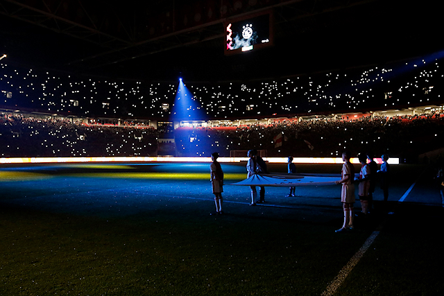 Veel supporters die vaak naast een kaartje vissen, grepen nu de kans met beide handen aan om Ajax van dichtbij aan het werk te zien. Bij de club begrepen ze ook wel dat het publiek vermaakt moest worden, dus werd er een onvervalste lichtshow tegenaan gegooid en klonk het 'blah, blah, blah' snoeihard door de speakers. De Champions League-hymne ontbrak, maar verder werd het draaiboek keurig afgewerkt.