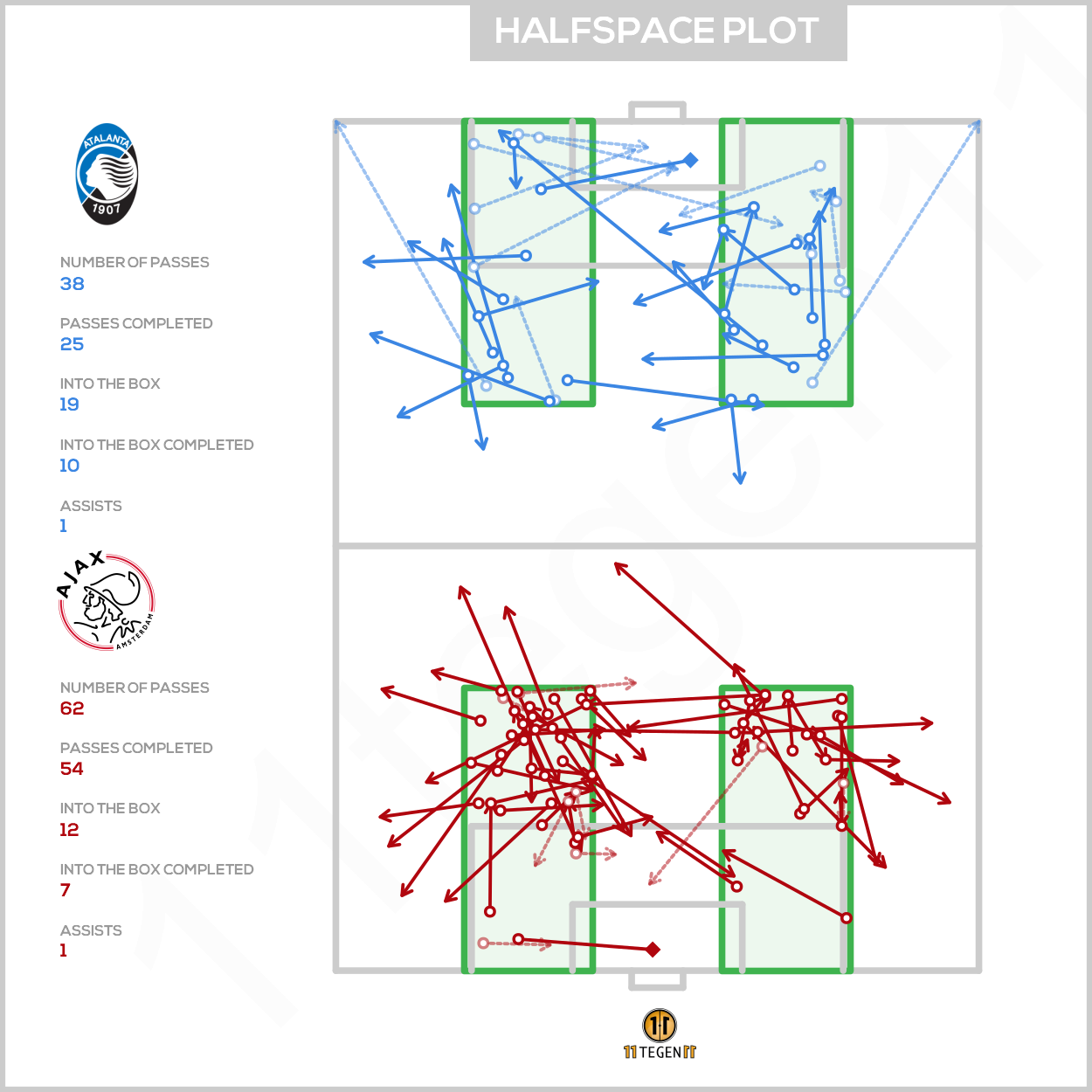 Atalanta staat bekend om het hoge druk zetten. De twee spitsen dekken de twee centrale verdedigers, de middenvelders spelen man-op-man en de backs dekken door op de backs van de tegenstander. Om dit te ontregelen was het de bedoeling om de backs van Ajax wat dichterbij André Onana te zetten en Schuurs (en soms Blind) wat dichter bij het middenveld.