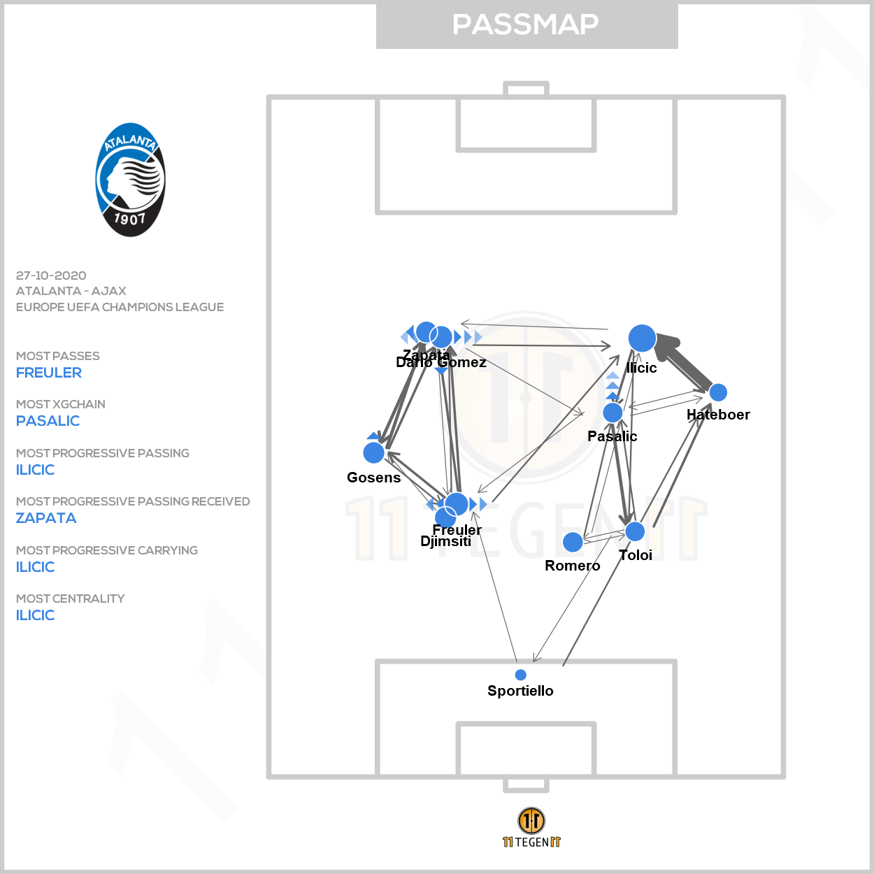 En omdat we Ajacieden zijn – en dus houden van diepte voor breedte – nog even de passmap van Atalanta. Gasperini's Atalanta speelt voetbal dat je kunt typeren als het tegenovergestelde van het Frank de Boer-voetbal: weinig passes tussen de centrale verdedigers, snel vooruit, maar zonder dat het gaat om blinde lange ballen.