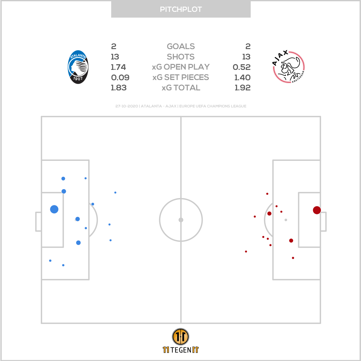 We zien verder dat het aantal gecreëerde schoten in deze wedstrijd precies gelijk was en het aantal Expected Goals ook. Aan de afbeelding hieronder is te zien dat Ajax uit open spel vrij weinig wist te forceren en Atalanta, als je puur naar het veldspel kijkt, gewoon de veel betere kansen heeft gecreëerd over negentig minuten gezien.