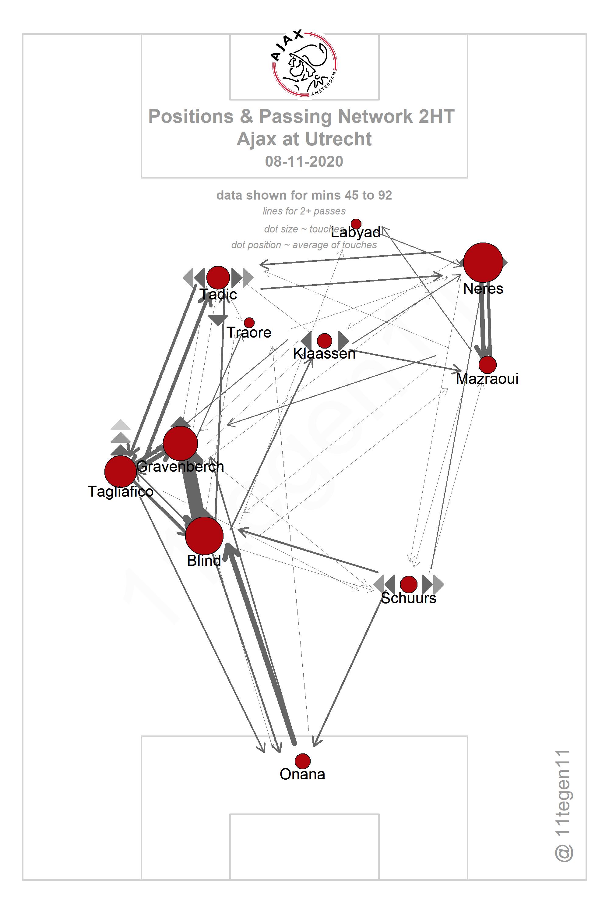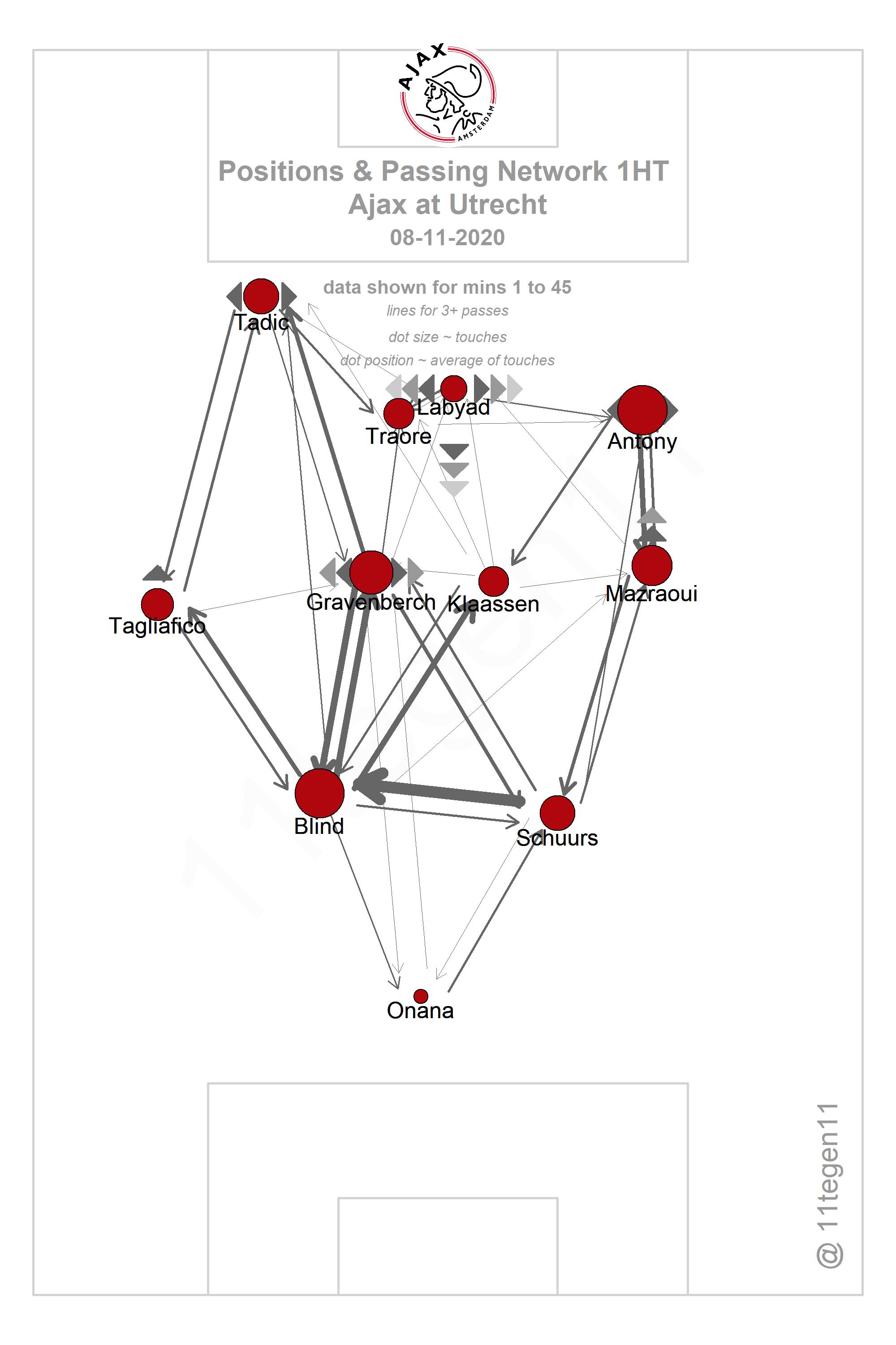 Hier is de dynamische passmap van Utrecht-uit! Kijk eens hoe belangrijk de linkerflank was, onder aanvoering van Tadic en Tagliafico maar gevoed door Gravenberch en Blind. De tandem spits/10 heeft nog wel zijwieltjes nodig... #utraja #ajax pic.twitter.com/bx2aLzbV0J