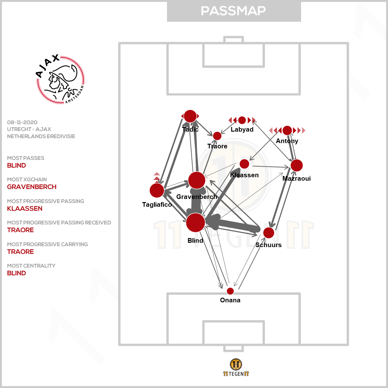 Weet je wat trouwens ook fijn is? En we niet onopgemerkt kunnen laten? Dat Davy Klaassen het vermogen bezit om belangrijk te zijn voor de ploeg zonder per se in balbezit te zijn. Kijk nog maar een keer naar de passmap. Klaassen was relatief weinig aan de bal – 44 passes versus 87 ballen van Gravenberch en zelfs 106 keer Blind – maar wel van doorslaggevend belang.