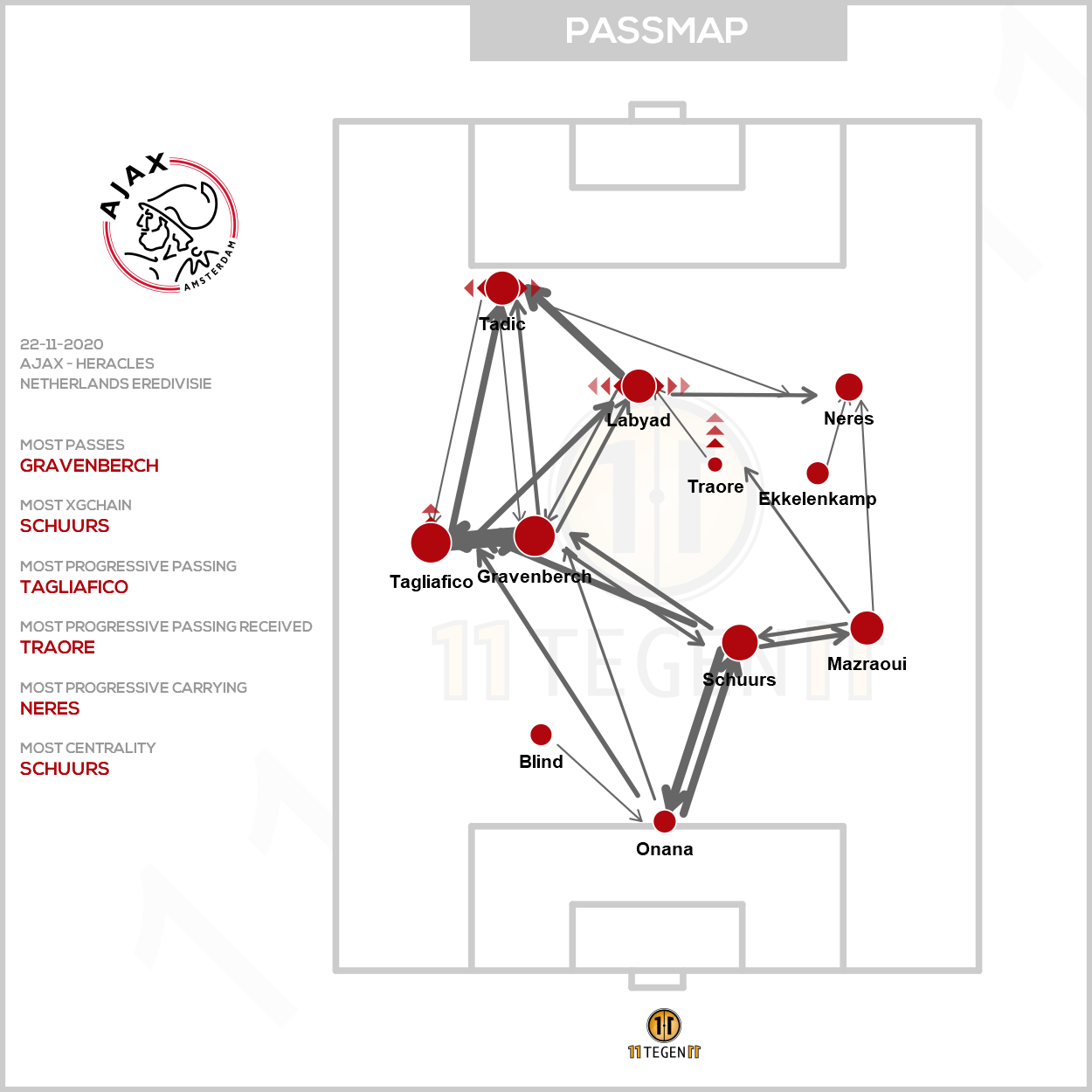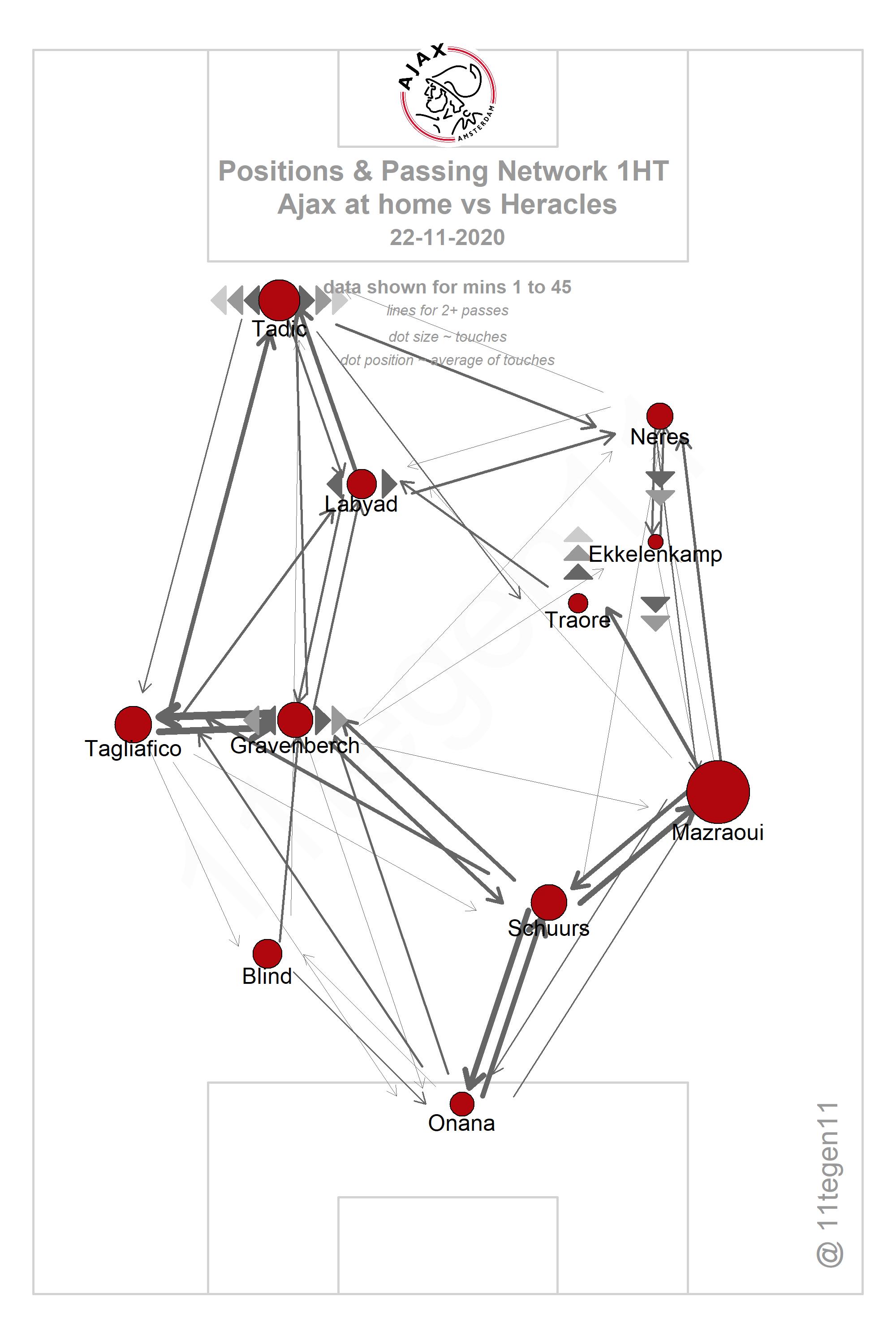 Aangezien Labyad zich vaak centraal op het veld ophoudt, wordt hij telkens ingezet om ervoor te zorgen dat Ajax vrijgespeelde ruimtes elders kan benutten. Kijk nog eens goed hoe de 1-0 tegen Heracles tot stand komt. Of naar de passmap. De wisselwerking tussen back en buitenspeler is belangrijk, maar die tactiek alleen wordt op den duur een beetje voorspelbaar.